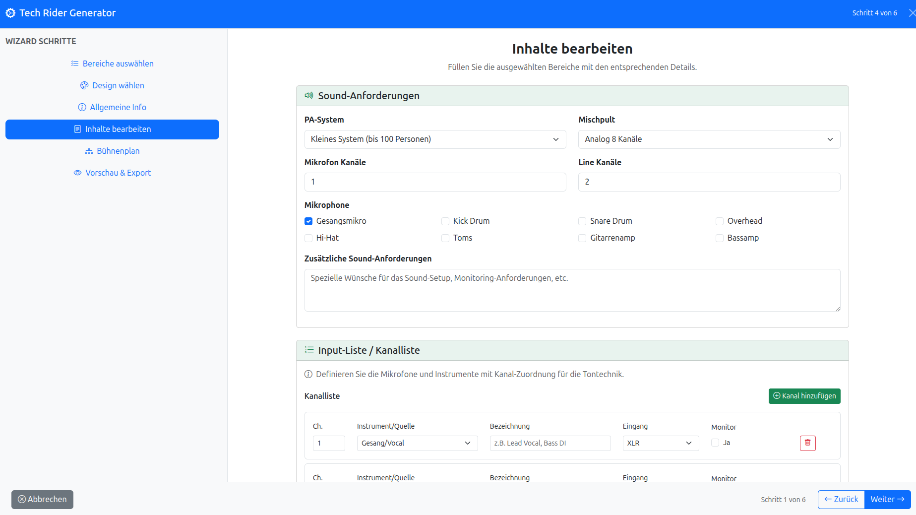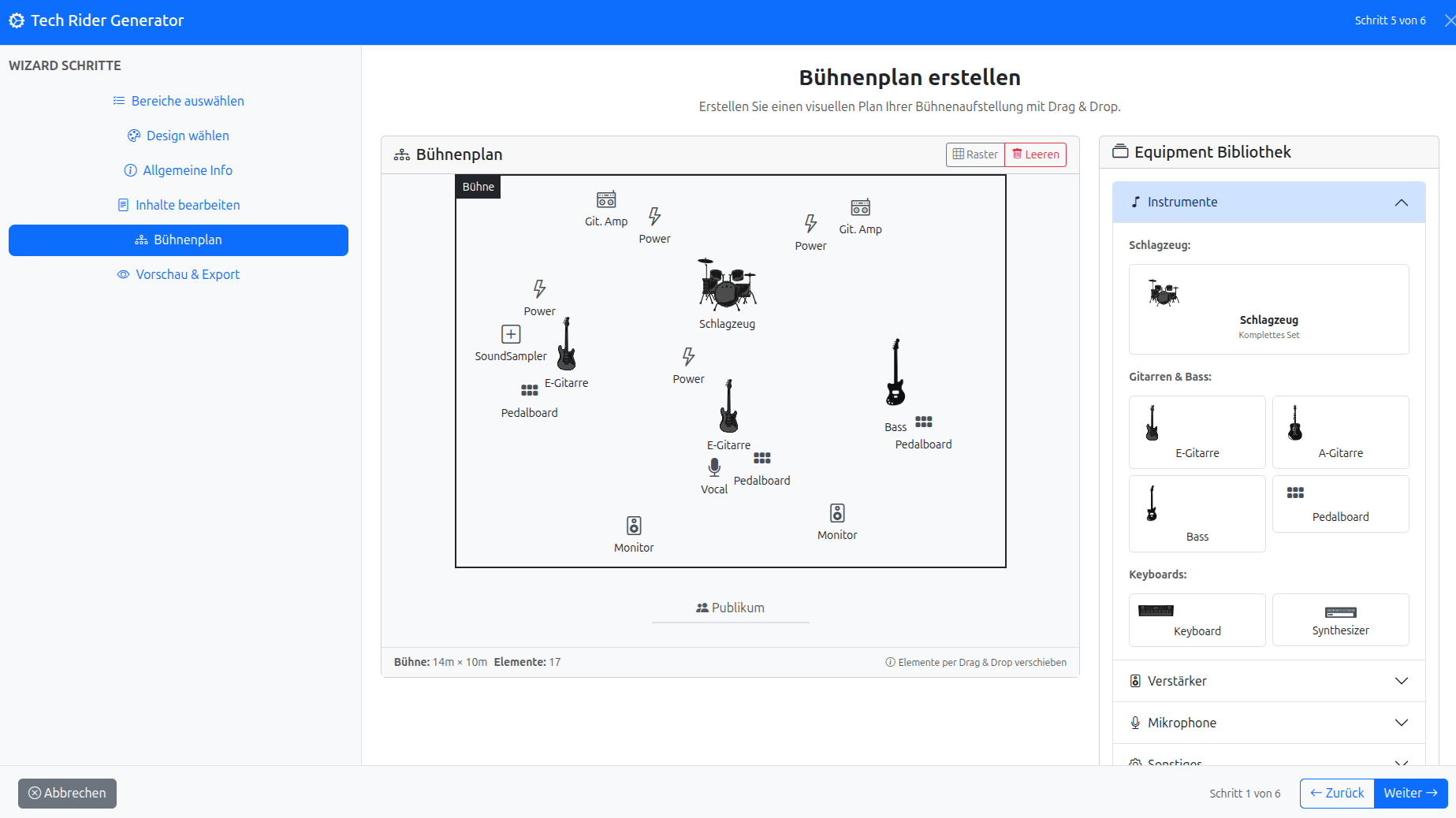 Inhalte strukturieren, Bühnenplan erstellen, als PDF exportieren.