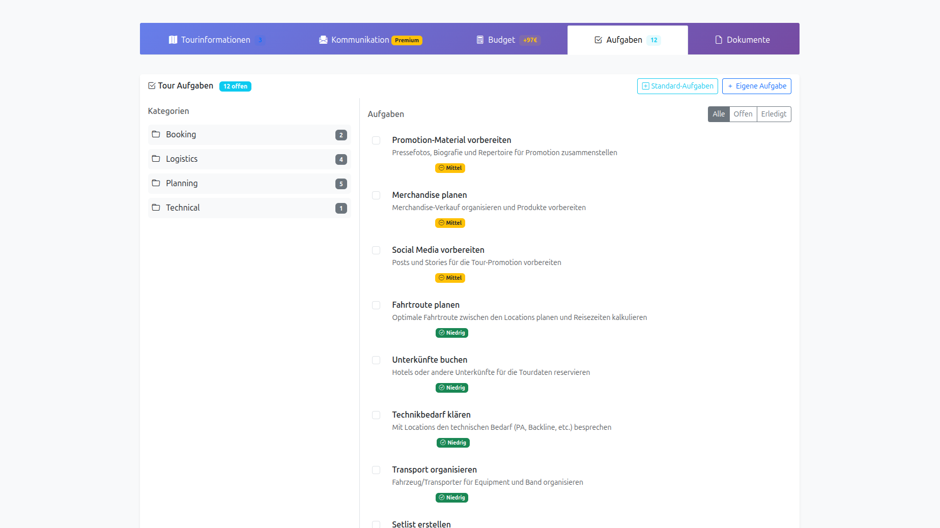 Catering, Backstage und Abläufe sauber dokumentieren.