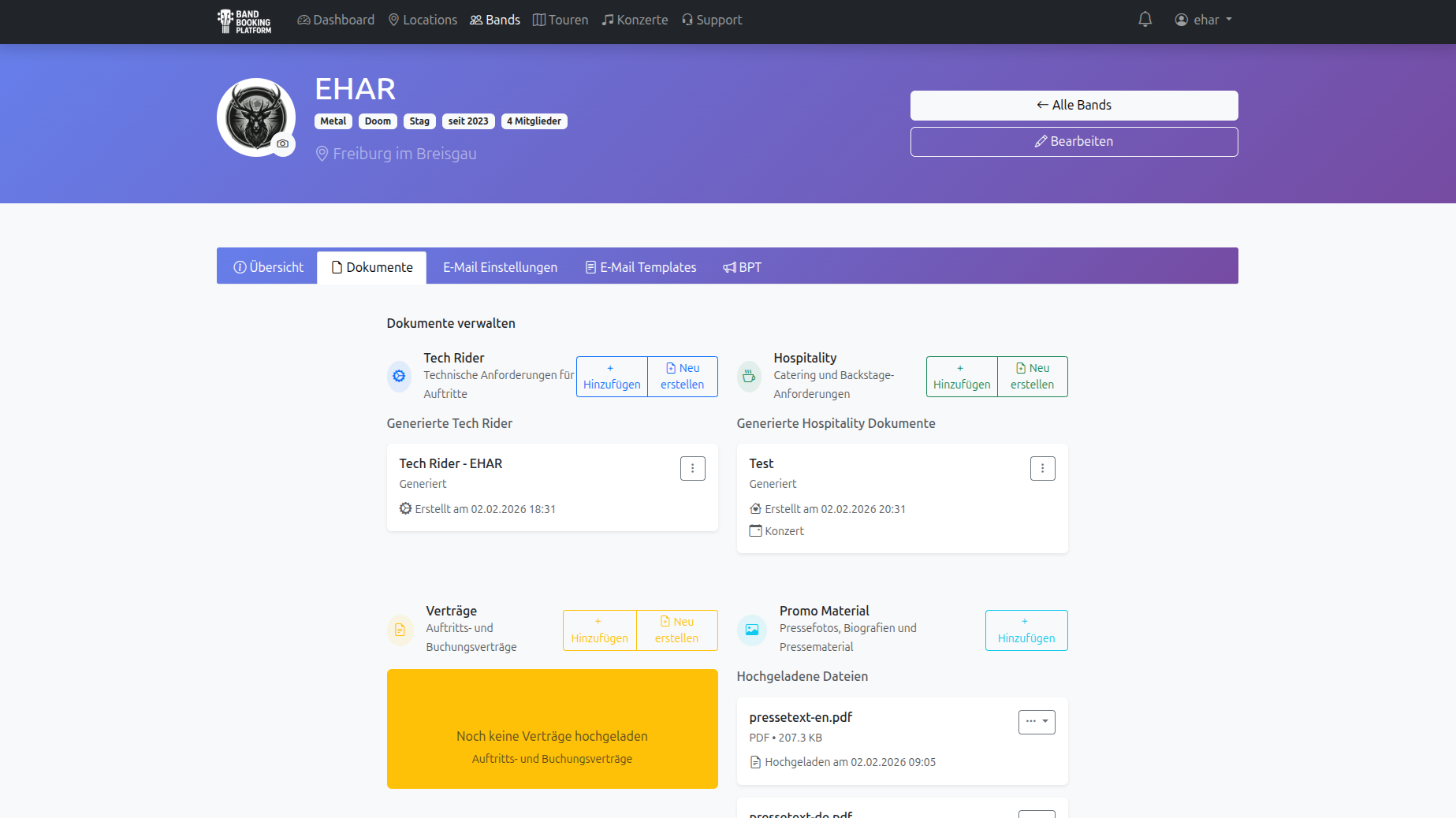 Uploads + generierte PDFs zentral – pro Band und pro Tour.
