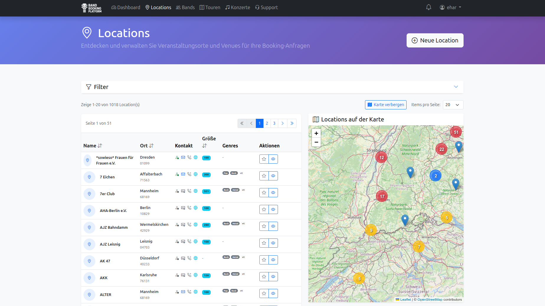 Venue-Datenbank + Filter, damit du schneller passende Orte findest.