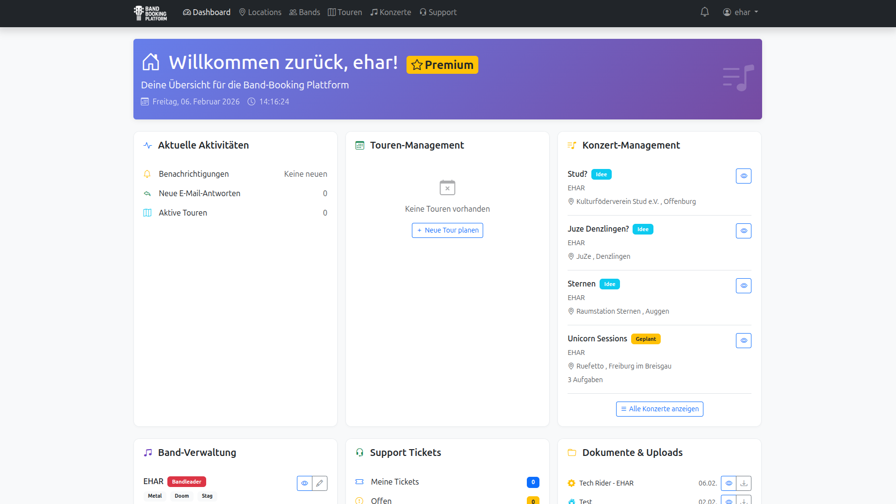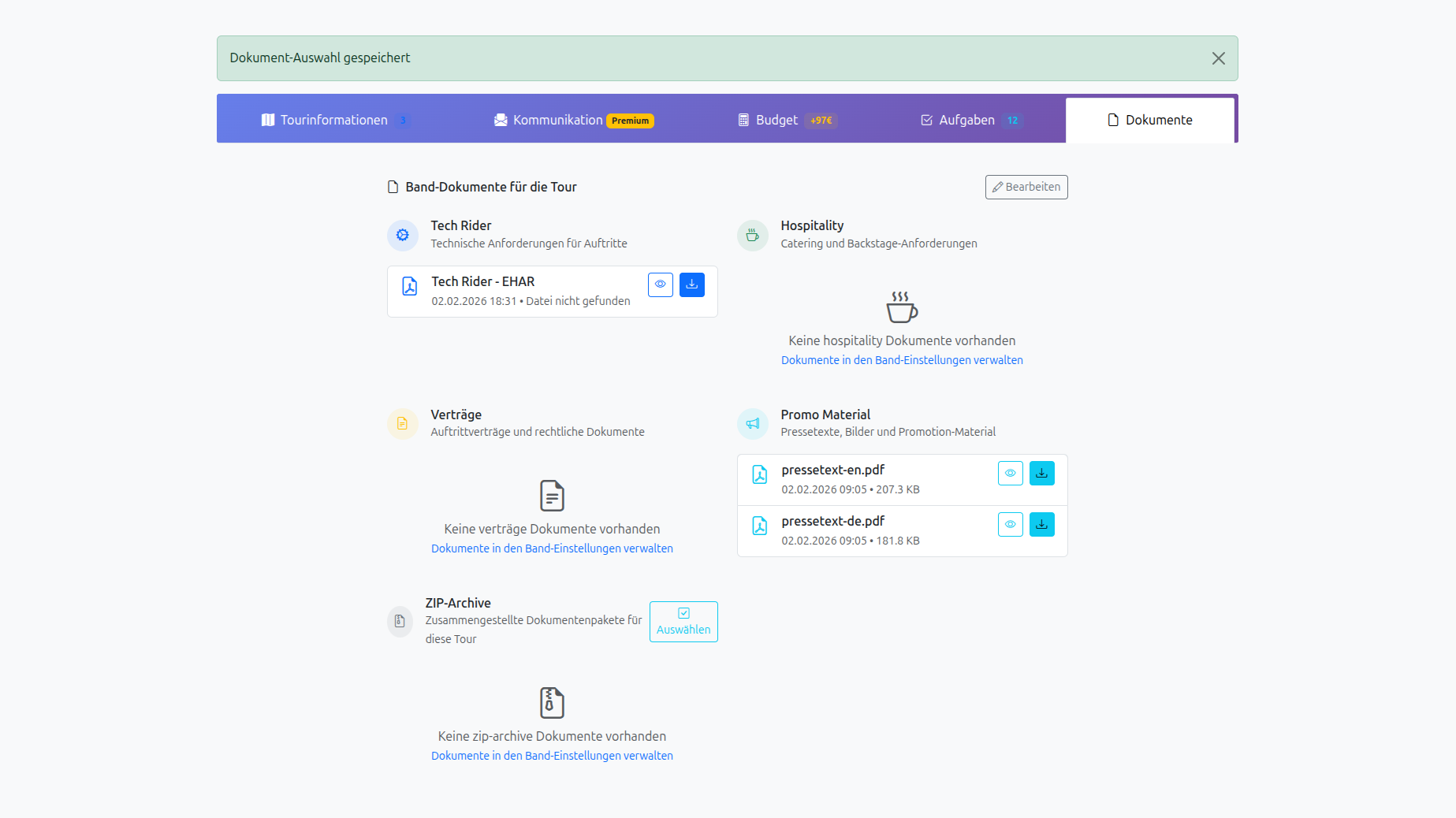 Uploads + generierte PDFs zentral – pro Band und pro Tour.