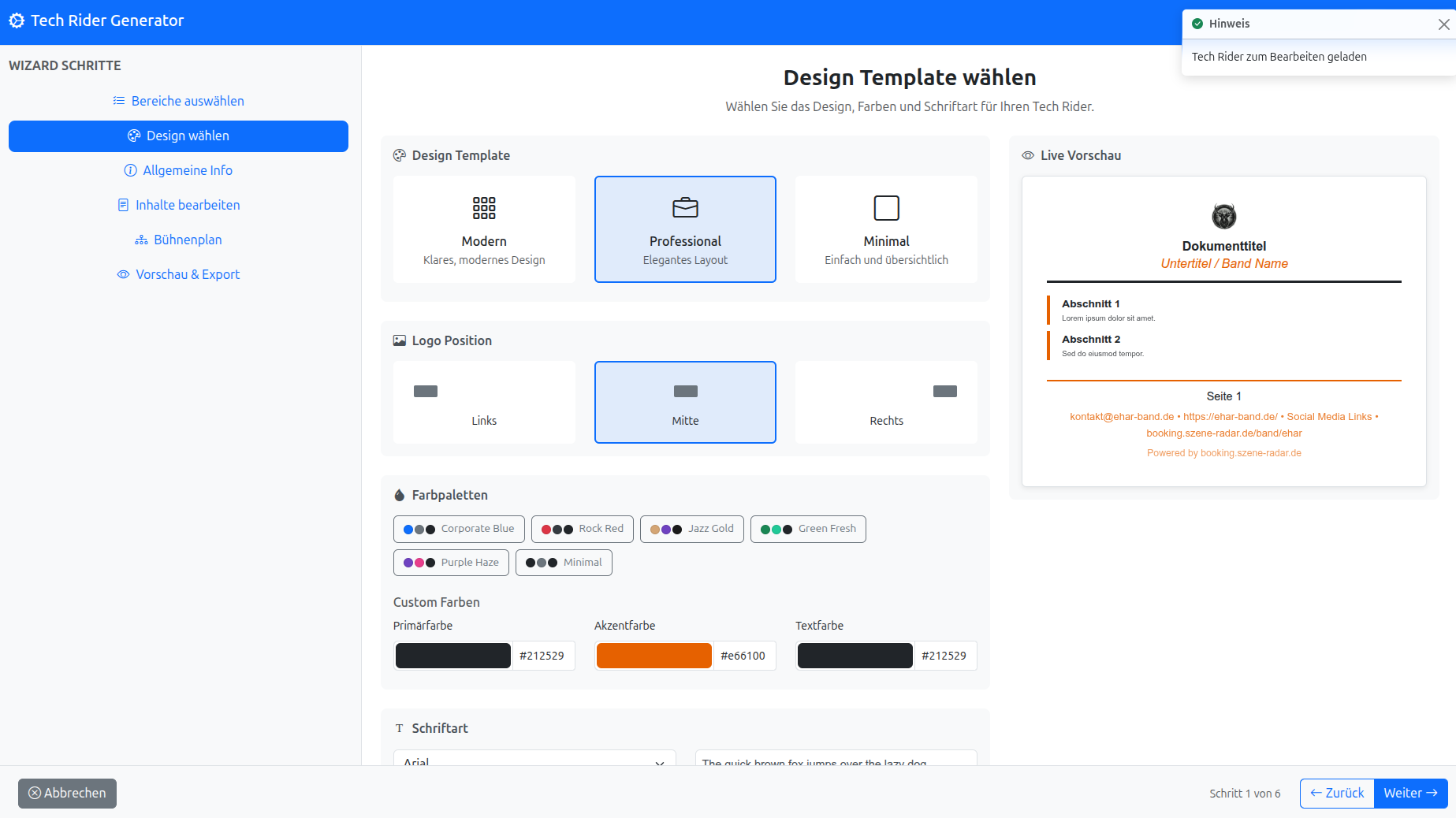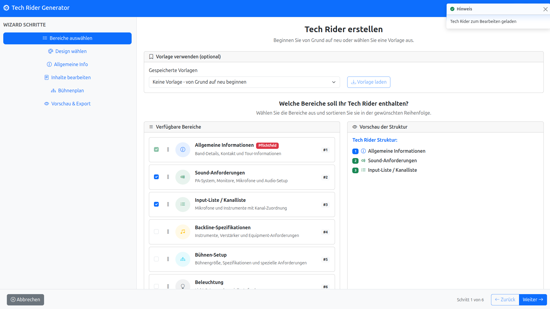 Tech Rider (Vorschau & Export)