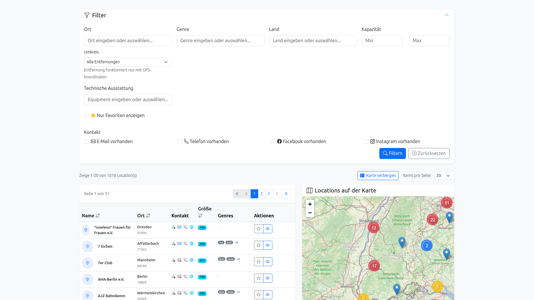 Venue-Datenbank + Filter, damit du schneller passende Orte findest.